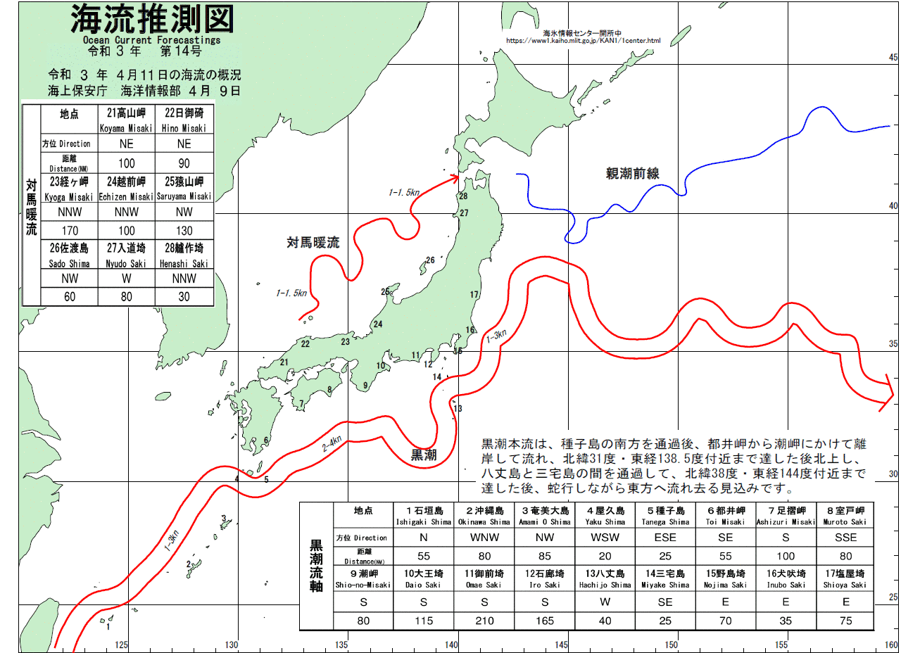 Mapa prognozy Kurosiwo (Kuro-sio) wydawana raz na tydzień (w piątek). W obrębie prądu wpisane jego prognozowane prędkości w węzłach. W tabelach, w wyznaczonych punktach (numery w rejonie Kuro-shio) podano kierunek i średni dystans w Mm z ostatniej analizy. Mapa wydana 9 kwietnia 2021 r., prognoza ważna od 9 do 14 kwietnia 2021 r. Adres do mapy: Japan Coast Guard. Aktualna mapa zawsze dostępna też tutaj. Zmiany w położeniu osi Kuro-shio w ciągu ostatnich 5 dni zobaczyć można również tutaj.